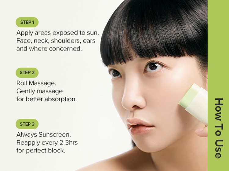 - At the last step of your skincare routine, twist the base of the stick to reveal the product and apply it evenly to areas of the skin that will be exposed to the sun.