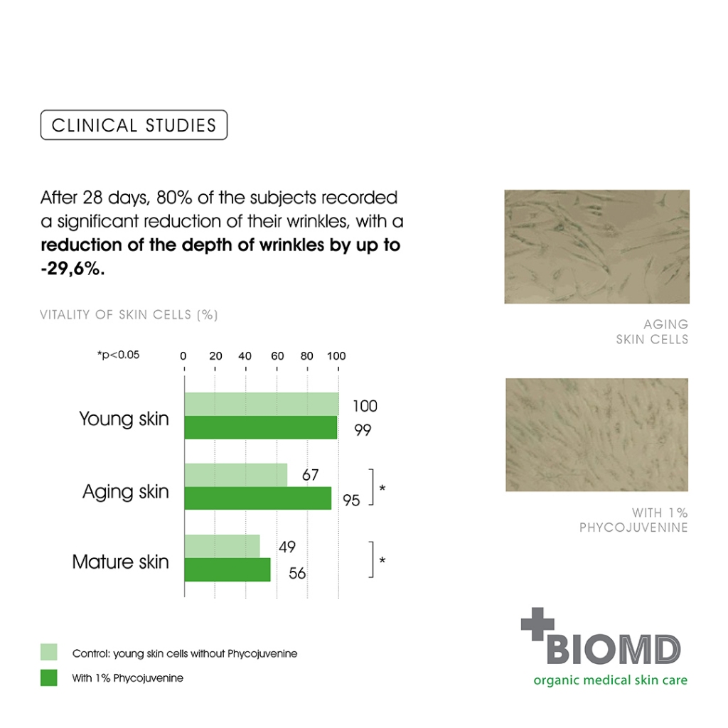 • Rejuvenates fibroblasts / activates collagen synthesis by +150% Clinical tests showed after 28 days of twice daily use of Phycojuvenine that 80% of volunteers observed a significant reduction in the main wrinkle with a reduction in mean roughness of up to -29.6%. Skin gets plumper, regains its elasticity and flexibility and the appearance of wrinkles can be visibly improved.