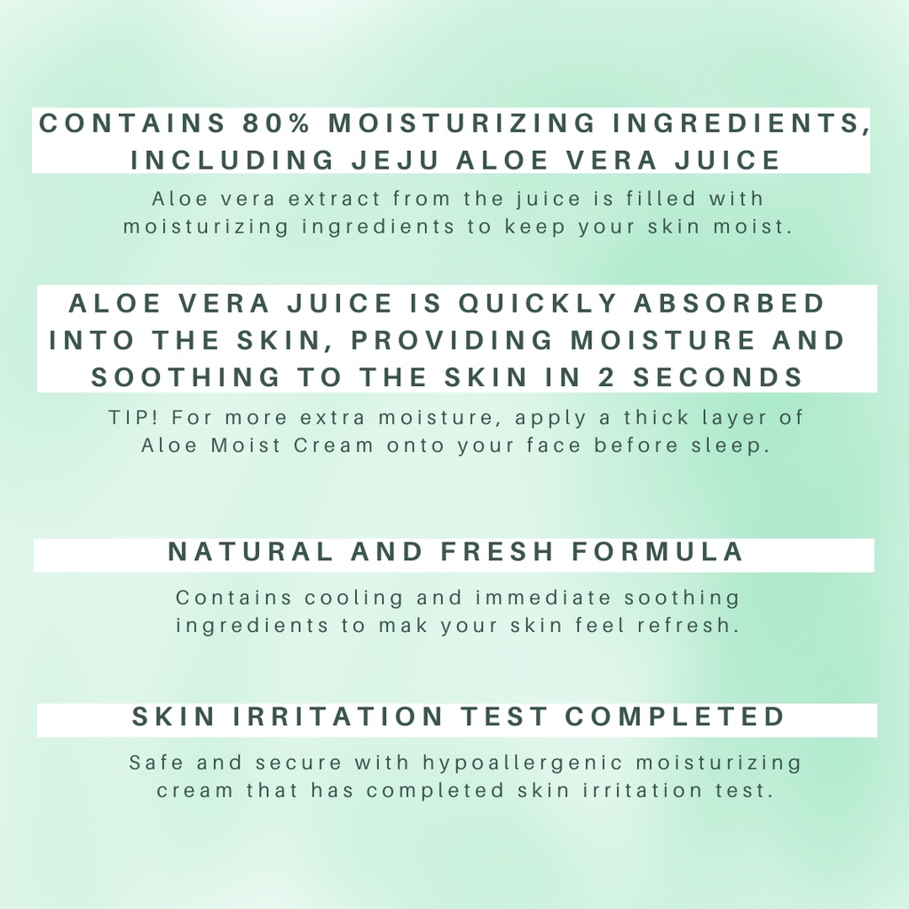 Soothe, restore and soften your skin with Aloe Soothing Essence 80% Moist Cream. With 80% aloe vera extract, this cream richly moisturizes and nourishes the skin, restores freshness, has a calming effect and improves its texture, giving it a smooth and silky look.